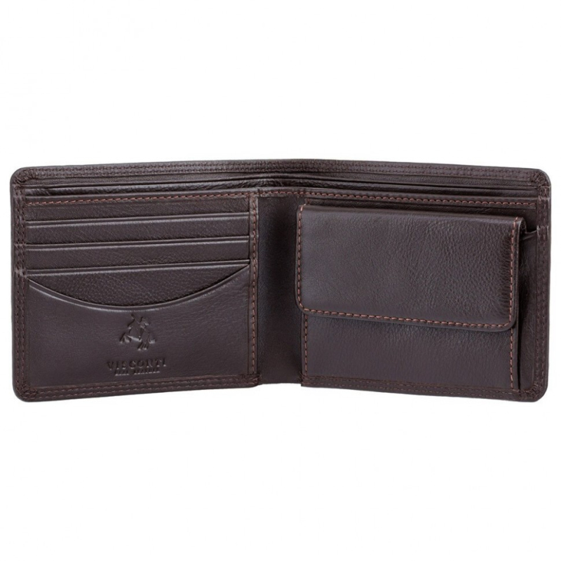 Značková hnedá tenká pánska kožená peňaženka sa vyznačuje na omak príjemnou prémiovou prírodnou kožou, kvalitným ručným prešitím a značkovou podšívkou so znakmi Visconti.