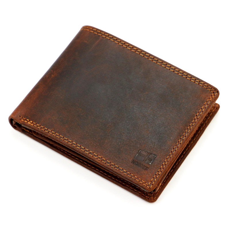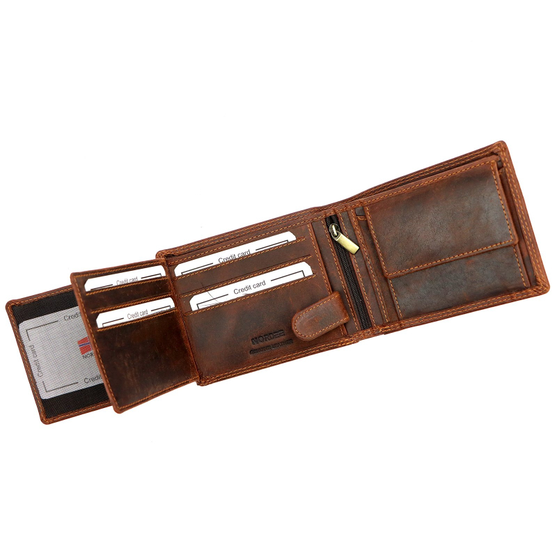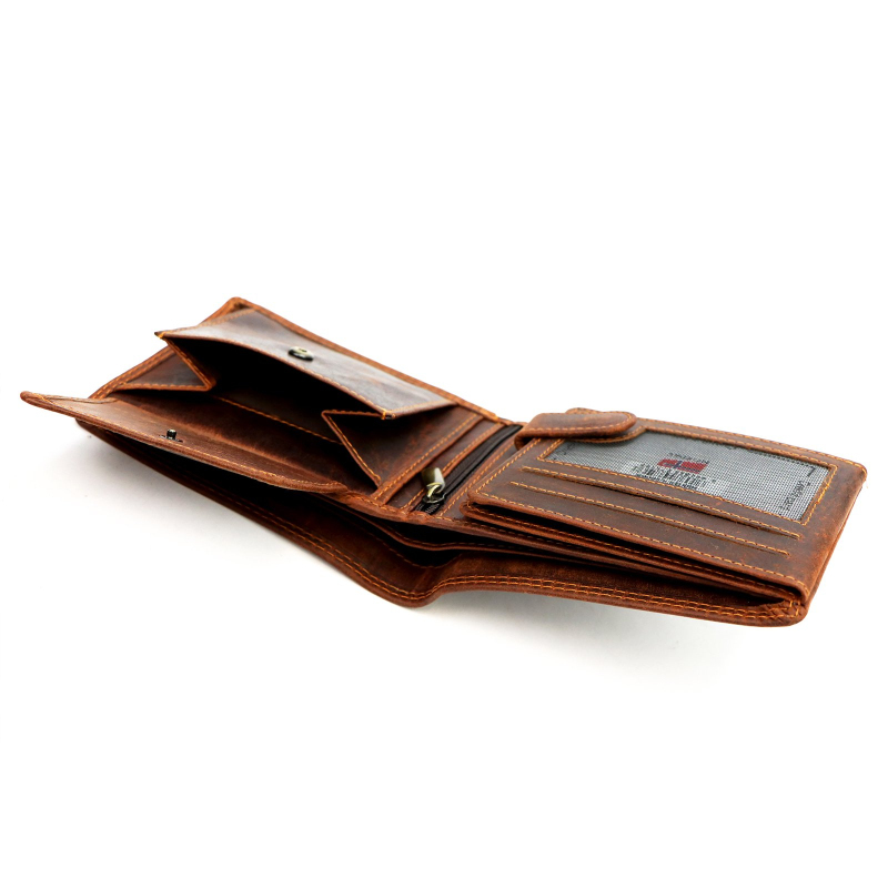 Kvalitná pánska peňaženka z prírodnej kože, má 2 priehradky na bankovky a jednu na kovové mince. Ďalej je vo vnútri pánskej peňaženky 8 priehradiek vhodných na karty a 5 väčších vreciek na technický preukaz, alebo iné doklady. Aby bolo možné zladiť celkový vzhľad, je možné k peňaženke tiež zakúpiť hnedý opasok a pánsku tašku.