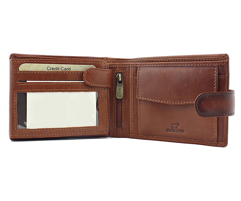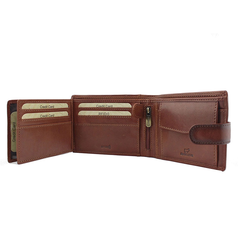 Luxusná pánska peňaženka z prírodnej kože má 2 priehradky na bankovky a jednu na kovové mince. Ďalej je vnútri pánske peňaženky 8 priehradiek vhodných na karty a 3 väčšie vrecká na občiansky, vodičský, alebo iný doklad.