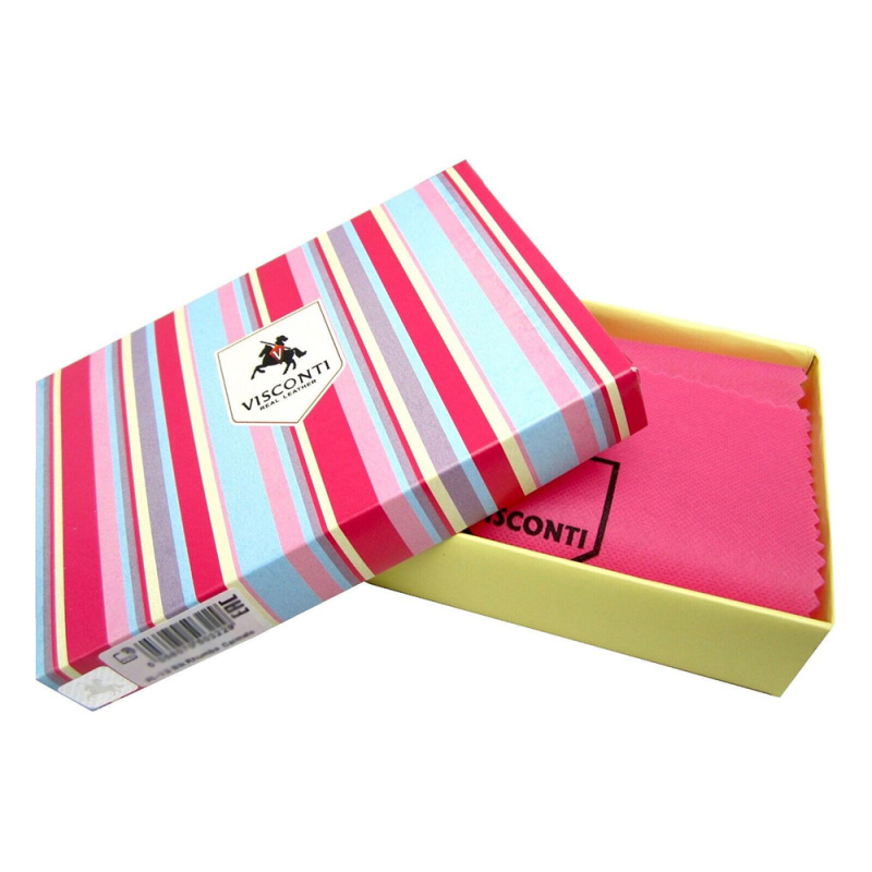 Menšia značková dámska peňaženka Visconti sa vyznačuje na dotyk príjemnou mäkkou kožou, dekorovanou dvojitým obšitím. Aj pri použití kvalitnej prémiovej prírodnej kože má ale stále vynikajúci pomer ceny v kombinácii s trvanlivým, praktickým a nadčasovým dizajnom.