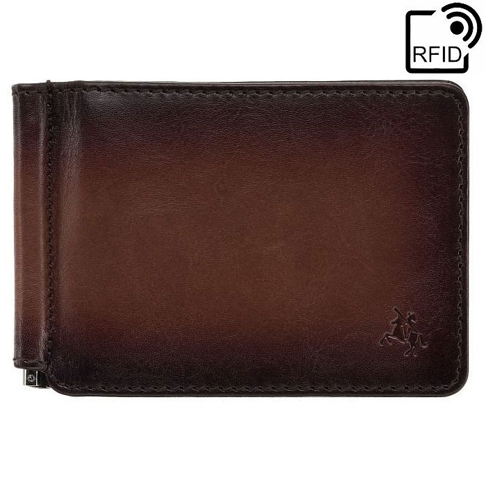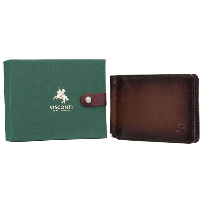 Značková pánska peňaženka dolárovka Visconti hnedej farby sa vyznačuje na dotyk príjemnú mäkkou kvalitnou prémiovou prírodnou kožou. Pánska dolárovka má 8 priehradiek na karty a sponu na prichytenie papierových bankoviek eurových aj zahraničných mien. Pánsku koženú dolárovku ocenia všetci, ktorí majú radi tenké peňaženky a nepotrebujú vrecko na mince.