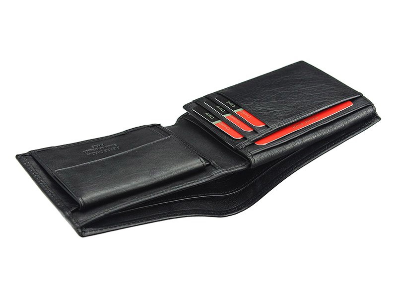 Má 2 priehradky na bankovky a jednu na kovové mince. Ďalej je vo vnútri pánskej peňaženky 8 priehradok vhodných na karty a tri väčšie napríklad na technický preukaz od vozidla.