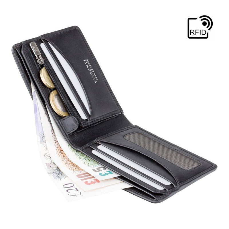 Značková pánska kožená peňaženka Visconti sa vyznačuje na dotyk príjemnou mäkkou prémiovou prírodnou kožou, kvalitným ručným prešítím a značkovou podšívkou so znakmi Visconti. Peňaženka má 2 priehradky na papierové bankovky vhodné pre eurové aj zahraničné meny, jedno vrecko na kovové mince, 5 slotov na karty a väčší priehľadný slot na osobné doklady. Súčasťou balenia je aj darčeková krabička na pánsku peňaženku.