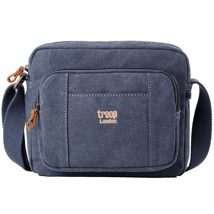 Značková taška Troop London je vyrobená z kvalitného pevného plátna. Predná časť obsahuje kapsičku napríklad na mobilný telefón, perá, peňaženku a iné drobnosti, väčšie vrecko potom môže slúžiť napríklad na prenos knihy, zápisníku, alebo tabletu.
