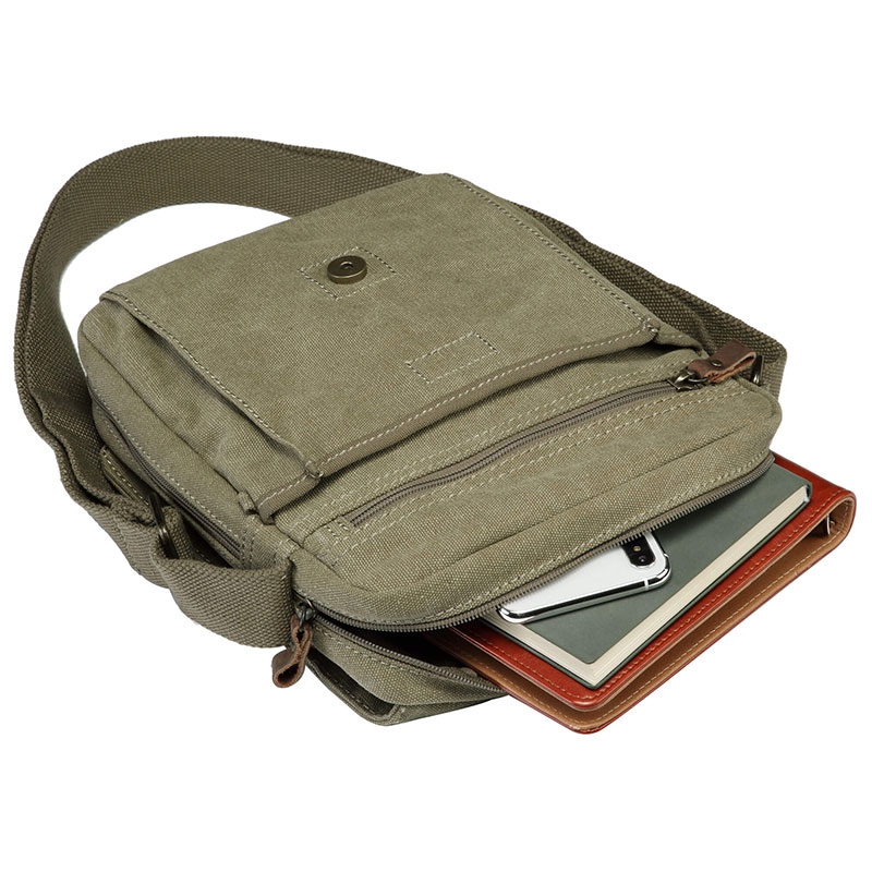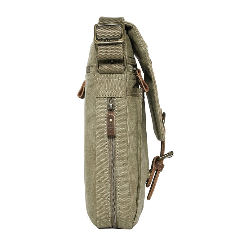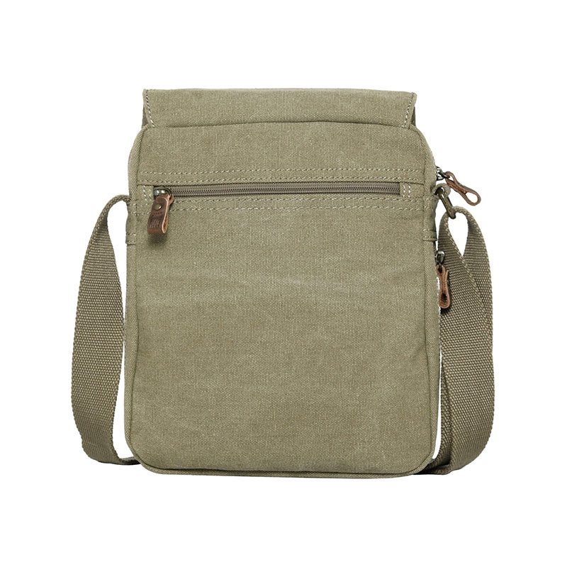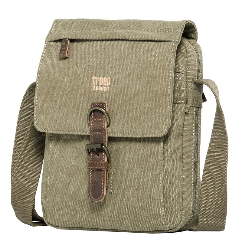 Značková crossbody Troop London je vyrobená z kvalitného pevného plátna, hlavné vrecko obsahuje aj menšie vrecko na drobnosti uzatvárateľné zipsom.