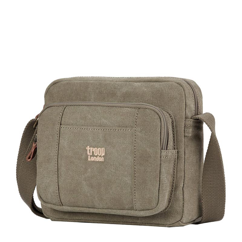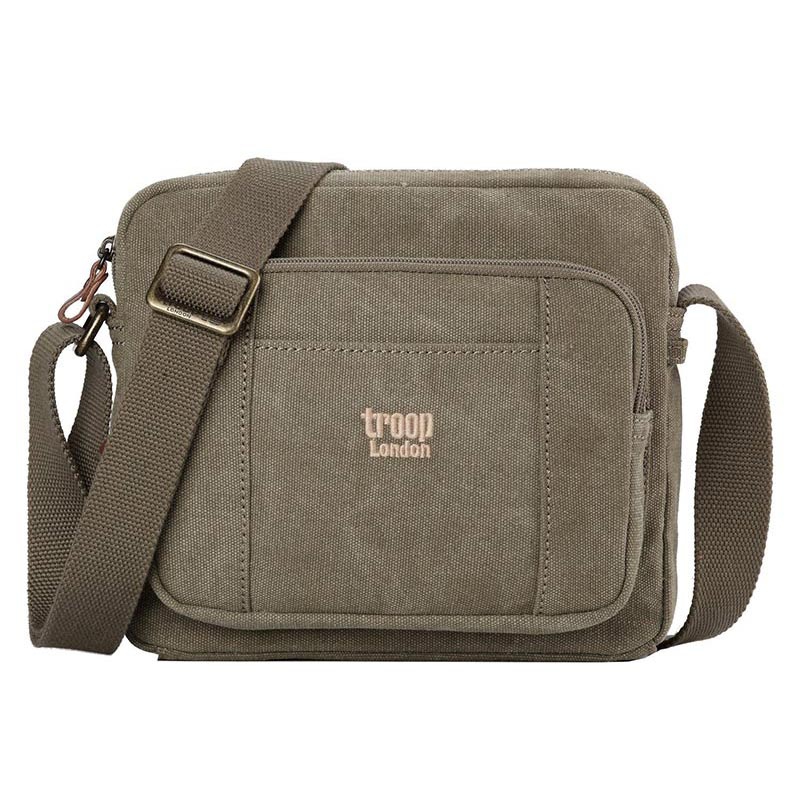 Značková taška Troop London je vyrobená z kvalitného pevného plátna. Predná časť obsahuje kapsičku napríklad na mobilný telefón, perá, peňaženku a iné drobnosti, väčšie vrecko potom môže slúžiť napríklad na prenos knihy, zápisníku, tabletu, alebo 500ml fľaše.